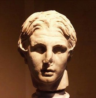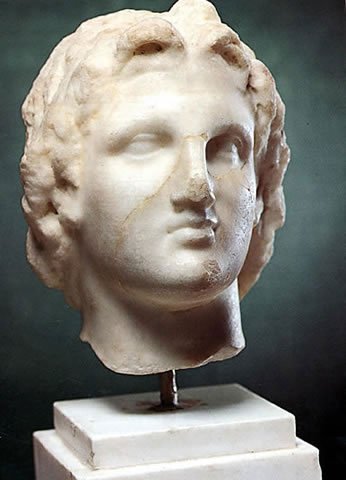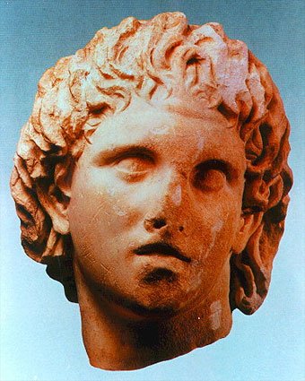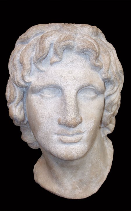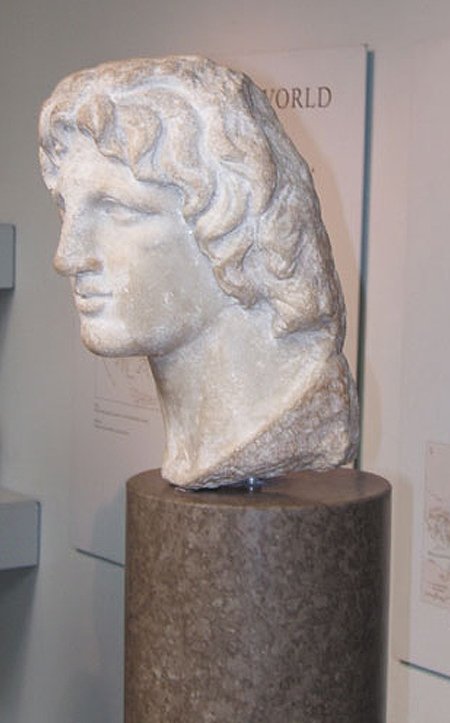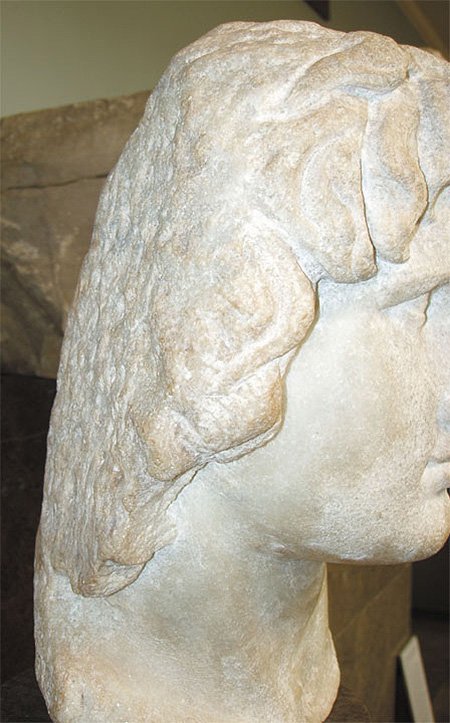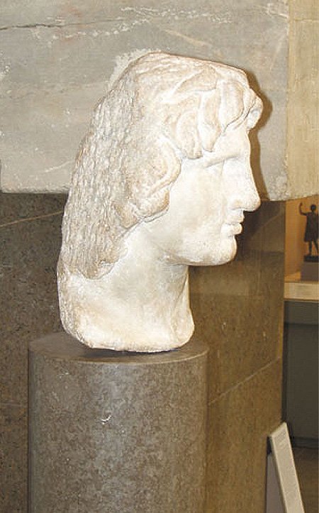 Marble portrayal head of Alexander the Great at the Museum of Pella. It is a chance find from the area of Pella, dated to the Hellenistic period. |