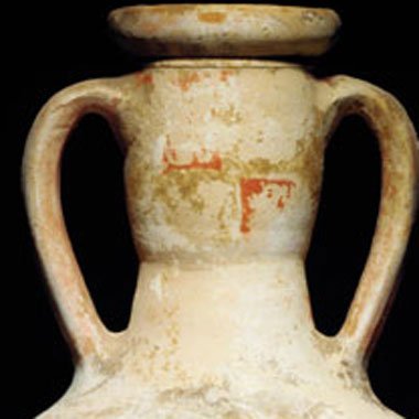 "Wine was not only a frequent companion and solace for the soldier, but sometimes an instigator no doubt an overabundant consumption of which at a party in the palace of Persepolis led to Alexander and his revelers torching the complex." The body tapered to knop base, remains of broad decorative band with white painted ground with red borders, remains of original red painted resin on neck and twin handles. 77.5 cm high. |
