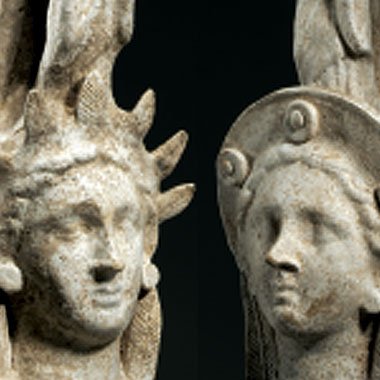 Each in the form of a female head with an oval face, small lips and straight nose, two wearing a radiate diadem of pointed leaves on either side of her neck, all surmounted by standing figures tightly wrapped in mantle, the back of their necks joining to the high-arching handles, traces of polychromy preserved on two. Each: 14 inches high. |
