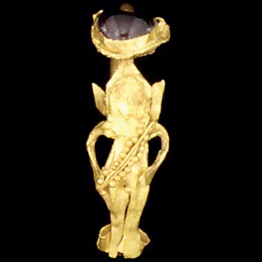 Gold figures of a winged and garlanded Eros with cabochon garnet setting above each figure. Provenance: The Sir Sidney Nolan collection. Christie's London, December 8, 1993. |