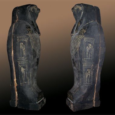 The mummiform falcon-headed wood lid and base is black with very nice gold details. The lid is adorned with Isis and Nephthys on the lappets, a broad collar, a winged scarab and three columns of hieroglyphs flanked by the Four Suns of Horus and images of recumbent Anubis flanking the tomb's door at the feet. The resin-coated mummy with linen bandages and a golden linen Osiris visage within the hollowed-out base, the back inscribed at the top with and Apis bull beneath a winged scarab and flanked by seated figures of Ibis-headed Thoth.80 cm. long.