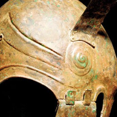 The domed crown with carinated perimeter at the rear, a moulded spiral motif on the temples, the extended wings with detailed feathering attached above, inverted v-shaped contours and moulded rib across the brow, attachment ring at the center back and front, with hinged cheekpieces.27.3 cmProvenance:Acquired in 1990.