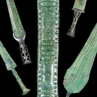 The first with hilt of waisted form, open cast with a pattern of triangles, inlays missing, domed pommel decorated with openwork cruciform pattern, (26.5 cm) long; another similar, the long blade with pronounced mid-rib, openwork hilt and crescentic guard, (40.7) long; a Bronze blade with short pierced tang, the blade cast with multiple grooves, early 1st millennium B. C., (45.8 cm) long; and two Luristan bronze daggers with flanged hilts, early 1st millennium B. C., (45 cm) long max. Provenance: Acquired in 1987, Frankfurt.