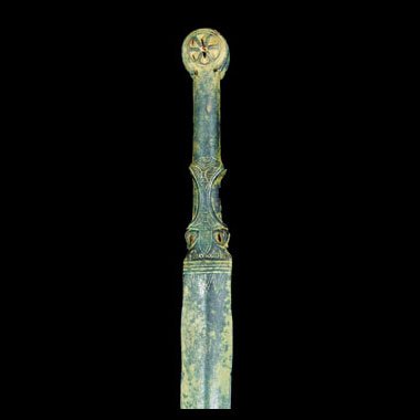 The hard blade with mid-rib, the grip and upper part of blade with incised decoration, the ribbed pommel with twin roundels each decorated with a six-petalled rosette recessed for inlay, traces of red pigment remaining.45.5 cm cf. O. W. Muscarella, Bronze and Iron, Ancient Near Eastern Artifacts in The Metropolitan Museum of Art, New York, 1988, pp. 285-286, no. 390 for similar. |
